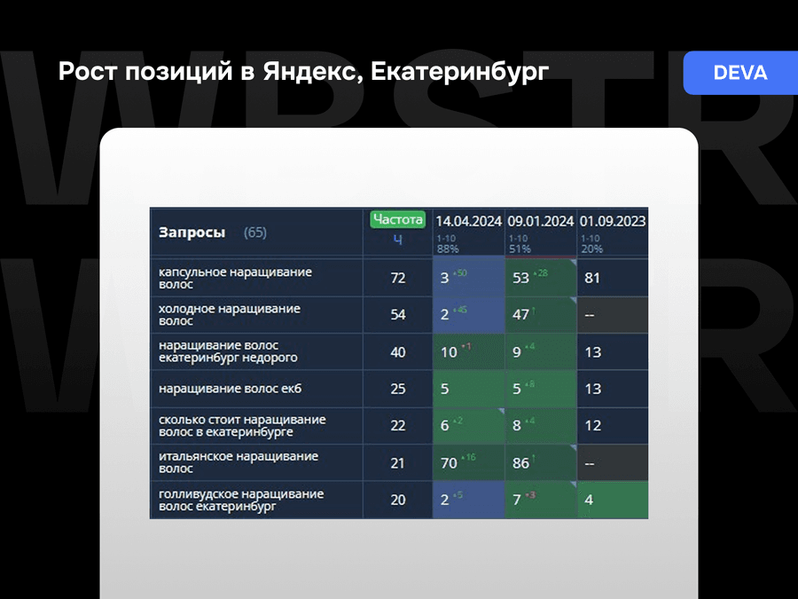 DEVA — сеть премиум-салонов по наращиванию волос в Москве, Санкт-Петербурге и Екатеринбурге. Клиент пришёл с запросом сделать сайт рабочим с точки зрения SEO и заявок. На старте сайт уже получал трафик, но по структуре и подаче больше напоминал визитку: без подробного каталога услуг, цен, отзывов и визуального контента, который напрямую влияет на доверие в этой нише. В результате бизнес оставался сильно зависимым от платной рекламы.