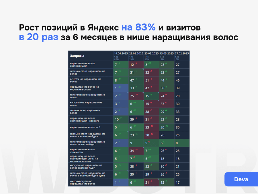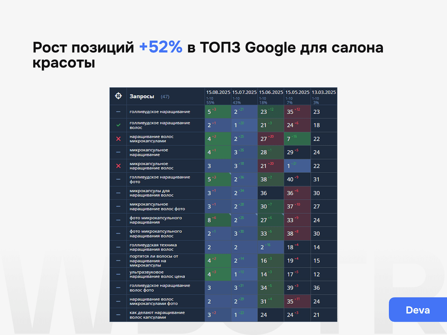 Мы не даём формальных гарантий по позициям — это запрещено политикой поисковиков. Но мы обеспечиваем контроль за результатами, прозрачную аналитику и корректировку стратегии при необходимости.