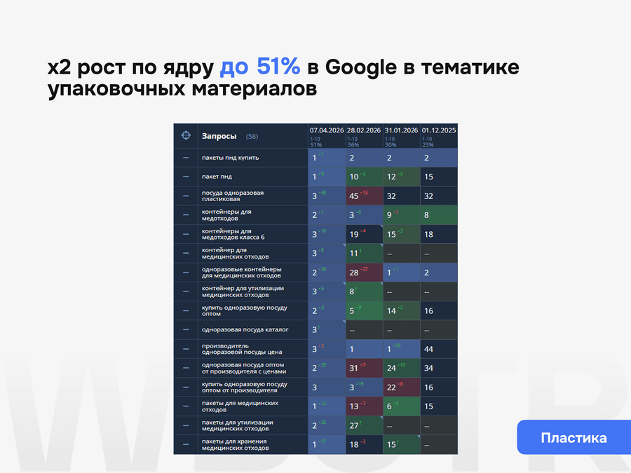 Продвигаем B2B-проекты и сайты производственных компаний, где важны не общий трафик, а точное попадание в целевой спрос, чистая структура и управляемая SEO-архитектура. Прорабатываем категории, номенклатуру, отраслевые посадочные, технический контент и коммерческие страницы так, чтобы сайт охватывал узкоспециализированные запросы, усиливал видимость по профильной семантике и приводил обращения от потенциальных заказчиков.